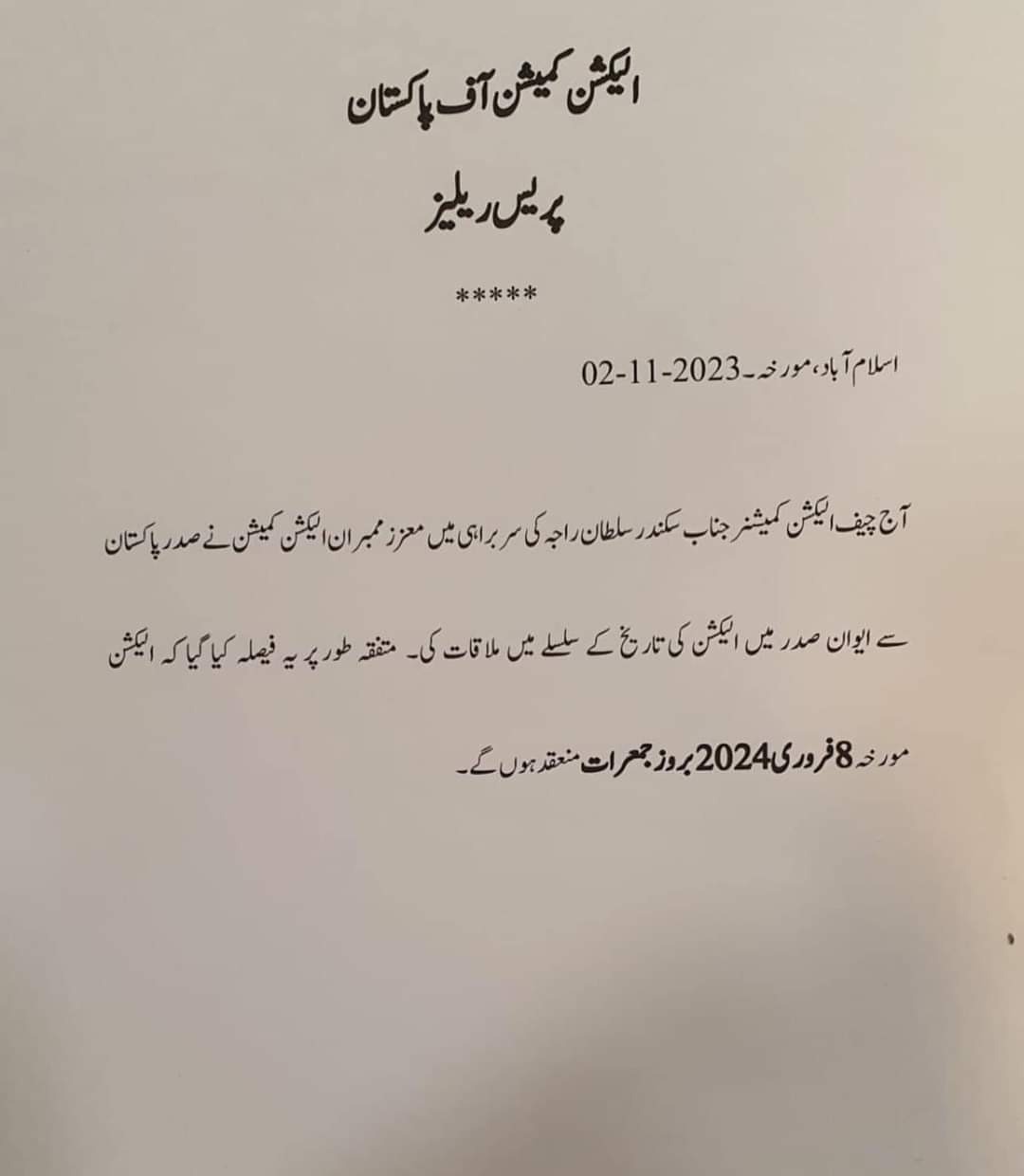 ECP, President Arif Alvi agreed to hold general elections in